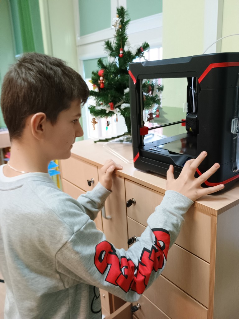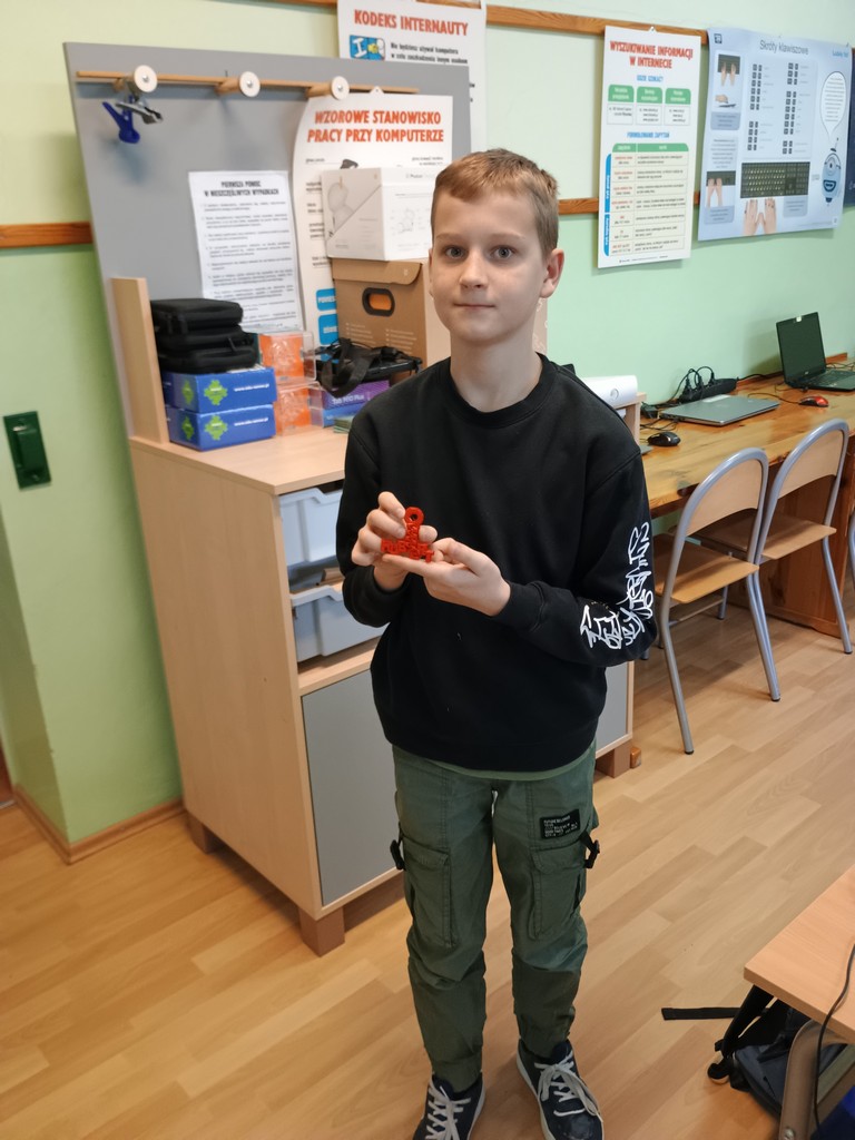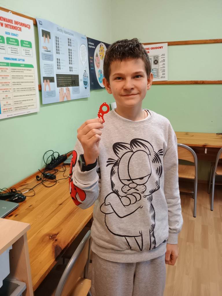Na zajęciach rozwijających kompetencje informatyczne uczniowie klasy szóstej i piątej zostali wprowadzeni w świat modelowania 3D. Zapoznali się z ogólną budową, działaniem, funkcjonalnością oraz zastosowaniem drukarki w praktyce. Wykonali swoje pierwsze projekty w programie Tinkercad. Jest to darmowy program do modelowania 3D online, który działa w przeglądarce internetowej. Następnym krokiem było przygotowanie pliku do druku za pomocą programu slicer Banach3D. Uczniowie mieli okazję zobaczyć efekty pracy drukarki 3D (udało się z sukcesem wydrukować projekt 3D breloka – zamek błyskawiczny z napisem Hubert). Kolejne prace to breloki do kluczy z numerami sal.