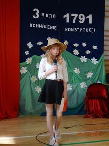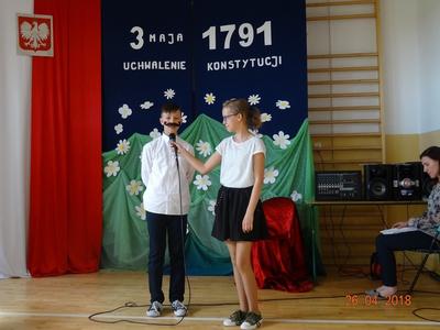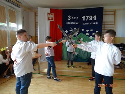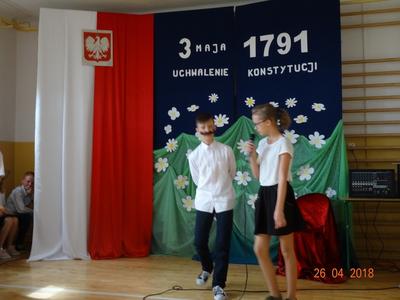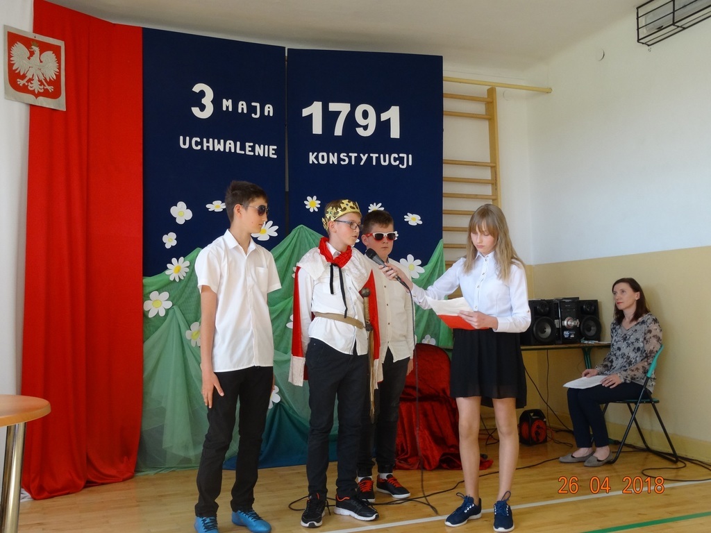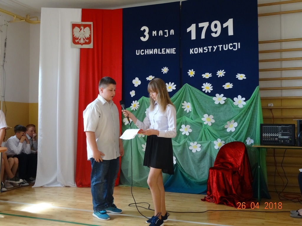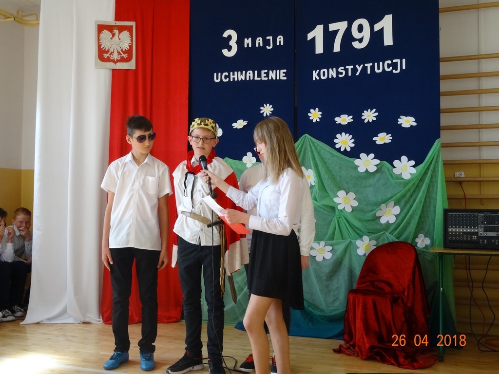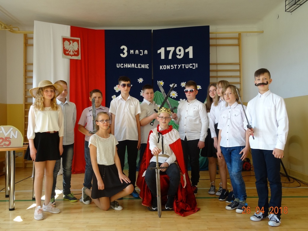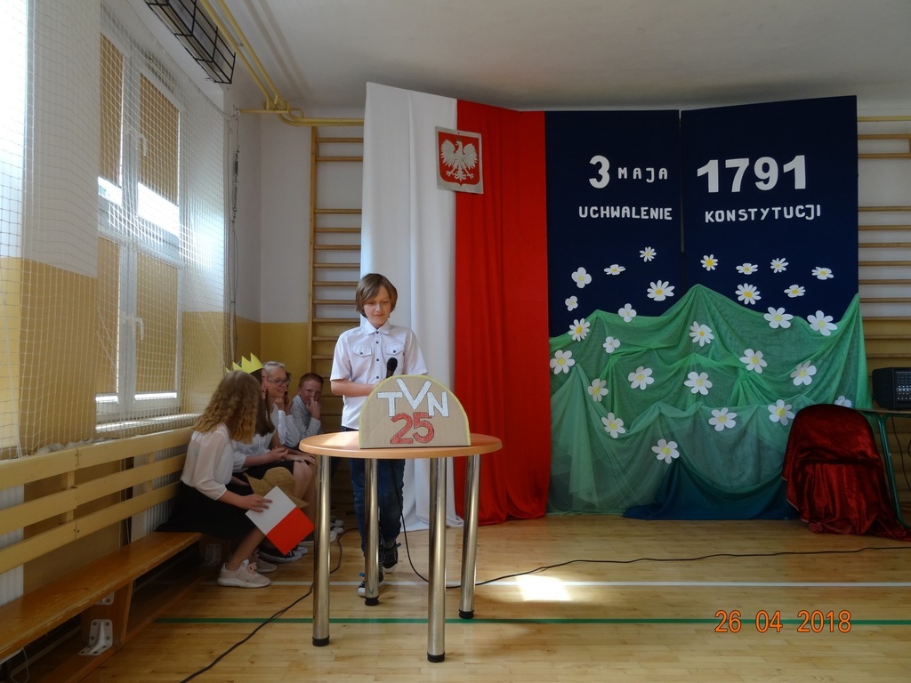W dniu 26 kwietnia uczniowie klasy szóstej pod kierunkiem wychowawczyni p. M. Pietrzyk przypomnieli historyczne chwile z czasów uchwalenia Konstytucji 3 Maja. W zabawnej formie Telewizyjnego TVN25 przedstawiali relacje autorów tego ważnego dokumentu: Króla Stanisława Augusta Poniatowskiego, Ignacego Potockiego i Hugona Kołłątaja, a także jej przeciwników, między innymi carycy Katarzyny i innych ważnych postaci z tamtej epoki. W relacji na żywo przedstawili najważniejsze fakty, czyli wprowadzenie trójpodziału władzy, utratę przywilejów szlacheckich, zniesienie liberum veto i inne. Na zakończenie odśpiewali pieśń „Witaj, majowa jutrzenko” oraz odczytali newsy dnia, które rozbawiły widownię. Dziękujemy klasie szóstej za te cenne fakty historyczne.