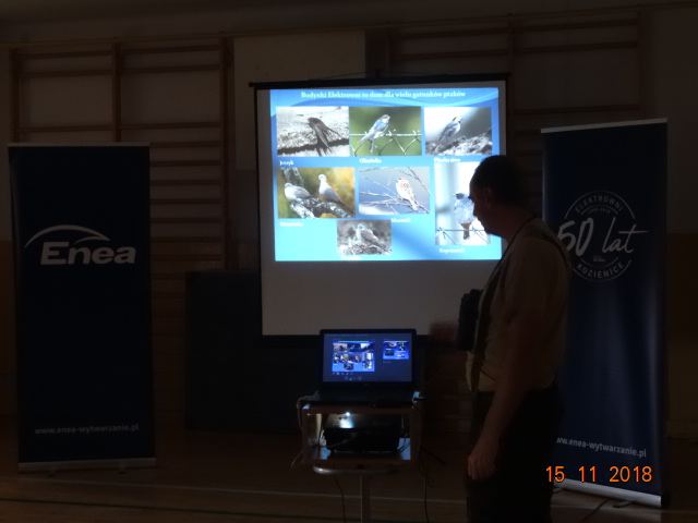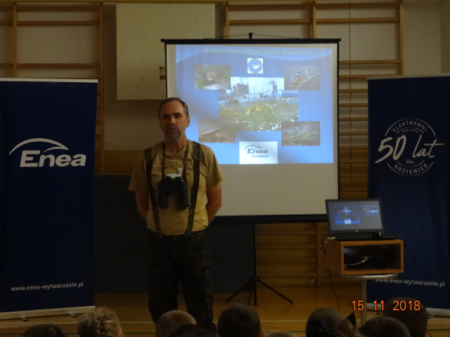 15 listopada uczniowie klas I-VIII uczestniczyli w projekcie edukacyjno-ekologicznym pt. „Zielone oblicze Elektrowni Kozienice" prowadzonym przez przedstawiciela Mazowiecko-Świętokrzyskiego Towarzystwa Ornitologicznego, pana Jacka Tabora, znanego przyrodnika i ornitologa oraz wolontariuszy Enei Wytwarzanie. Z ciekawej, przyrodniczej prezentacji uczniowie dowiedzieli się, że w najbliższych okolicach elektrowni istnieje duża różnorodność świata roślin i zwierząt. Jest wiele gatunków chronionych, między innymi wąż, gniewosz plamisty, największa z sów: puchacz oraz ciekawy owad, modliszka i wiele innych. Elektrownia dba o stan zieleni wokół jej terenu, zabezpiecza lęgi i miejsca rozrodcze zwierząt, przeprowadza akcje ratowania uwięzionych zwierząt. Na zakończenie spotkania uczniowie mieli okazję wykazać się zdobytą wiedzą w przeprowadzonym przez pana Tabora konkursie. Za udział i pozytywne odpowiedzi otrzymali nagrody od przedstawicieli elektrowni. Dziękujemy za te przyrodnicze ciekawostki.