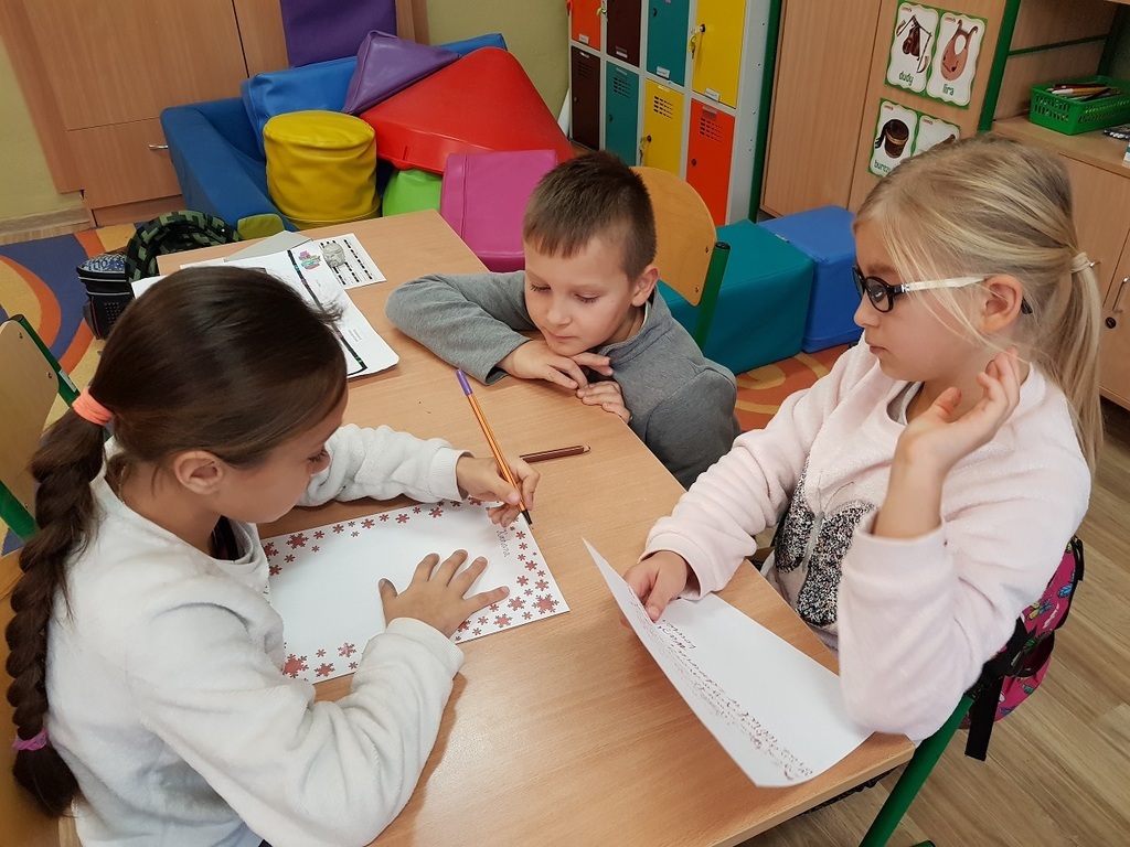 Tym razem zadanie wymagało znajomości podstawowych zasad pisania życzeń świątecznych. Każda z grup miała za zadanie tak poprowadzić robocika, aby wykonał odpowiednią komendę, przy wybranych zwrotach. Następnie trzeba było zwroty ułożyć w takiej kolejności, aby powstały poprawnie napisane życzenia, które będzie można wysłać do dziadków lub nauczyciela. Mimo, że zadanie nie należało do najłatwiejszych każdy poradził sobie znakomicie!