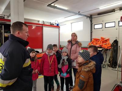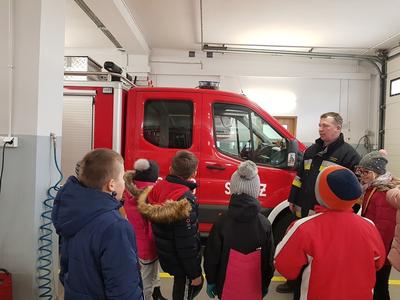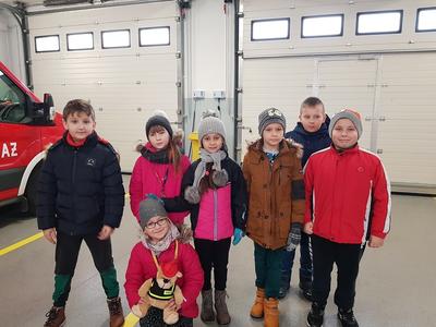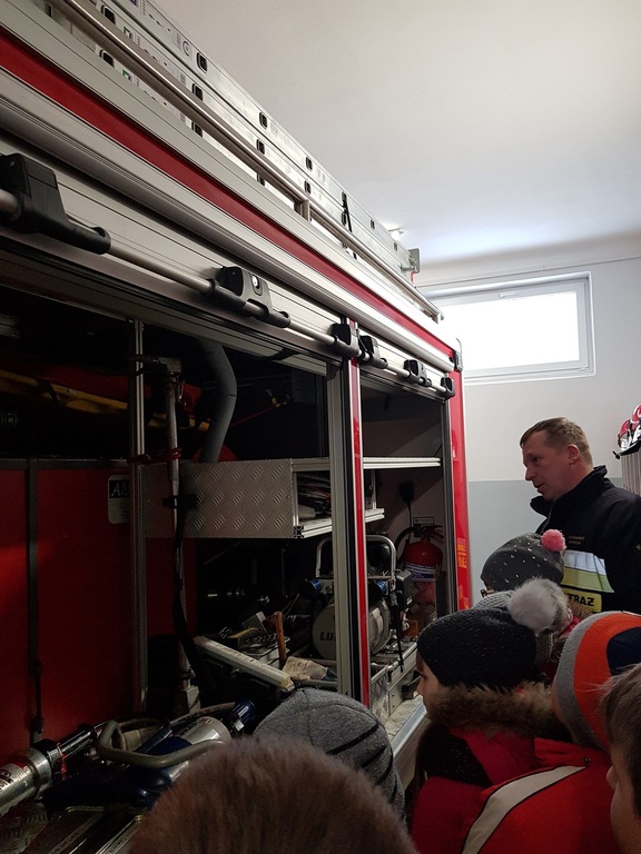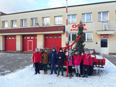 We wtorek 15 stycznia 2019 r. uczniowie klasy trzeciej udali się na wycieczkę do Ochotniczej Straży Pożarnej w Ryczywole. Na miejscu przywitał ich strażak OSP w Ryczywole, pan Marcin Ochmański. Dzięki jego życzliwości dzieci mogły obejrzeć samochody i sprzęt pożarniczy stanowiący wyposażenie jednostki oraz przekonać się, ile waży gaśnica i przymierzyć kask strażacki. Uczniowie przeprowadzili wywiad na temat pracy strażaka. Z uwagą słuchali opowiadań o kilku akcjach ratunkowych, w których p. Ochmański brał udział. Praca strażaka to nie tylko gaszenie pożarów. Obecnie strażackie samochody wyjeżdżają także do wszystkich tragicznych zdarzeń: wypadków drogowych, powodzi, katastrof. Na koniec uczniowie mogli na własne oczy zobaczyć maskotkę Misia Ratownika - bohatera opowiadania. Zrobił na nich duże wrażenie! Wycieczka była pouczająca i ciekawa.
