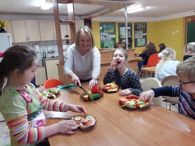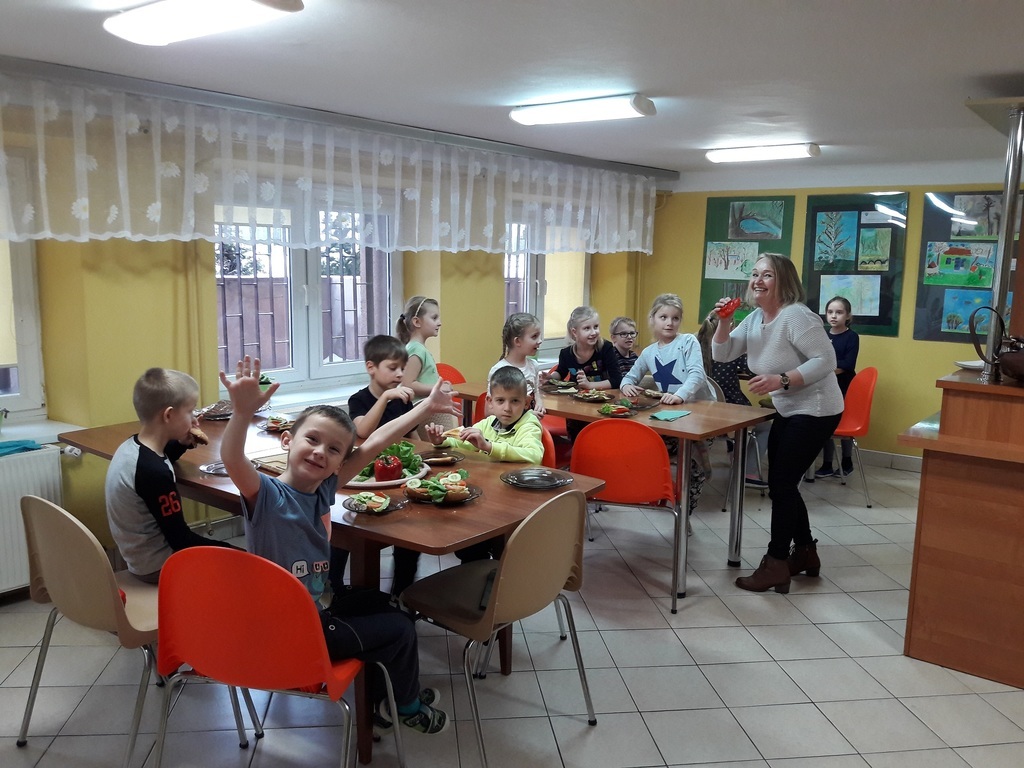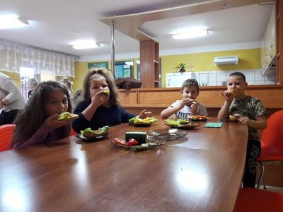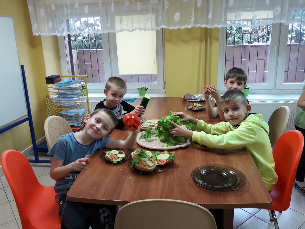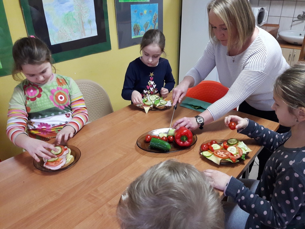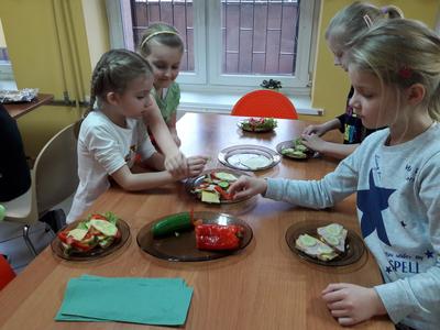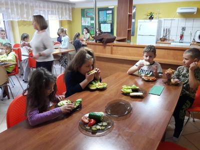 Uczniowie klasy 1. na zajęciach edukacji zdrowotnej w ramach innowacji pedagogicznej "Śniadanie z klasą" komponowali śniadanie zgodnie z piramidą zdrowego żywienia. Uczniowie pracowali w czterech grupach. Przygotowali kanapki z pełnoziarnistego pieczywa i starali się, aby na każdej kanapce były warzywa w różnych kolorach. Pełne witamin kanapki wszystkim bardzo smakowały.