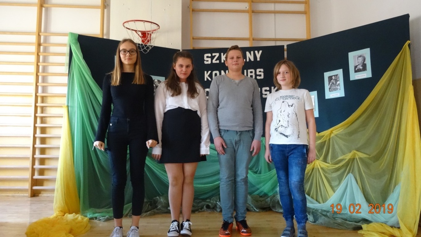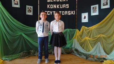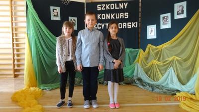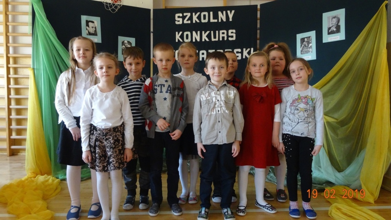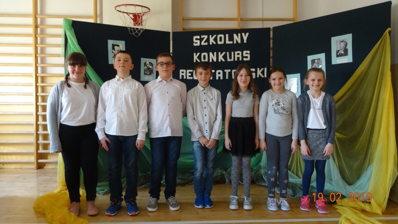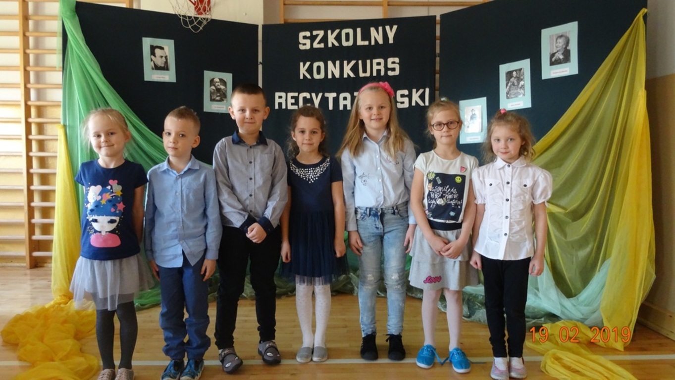 19 lutego 2019 r. w naszej szkole odbyły się eliminacje szkolne do XXXVI Małego Konkursu Recytatorskiego w Kozienickim Domu Kultury im. Bogusława Klimczuka. Do konkursu przystąpiło 38 uczniów z dwóch oddziałów przedszkolnych i klas I-VIII. Każdy z nich recytował jeden wiersz polskiego autora. Jury w składzie: pani Marianna Fusiek, pani Halina Boryczka i pani Magdalen Wnuk zdecydowało, że w eliminacjach środowiskowych wezmą udział następujące osoby: Filip Ochmański w kategorii klas I-IV i Miłosz Jemiołek w kategorii klas V-VIII. Poza tym niektórzy recytatorzy uzyskali wyróżnienia: Krzysztof Ochmański- oddz. przedszkolny, Natalia Nyrek- kl.I, Antoni Król- kl.III, Aleksandra Słomska- kl.IV, Aleksandra Kowalczuk – kl. VI i Alicja Kaca – kl. VIII.
