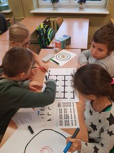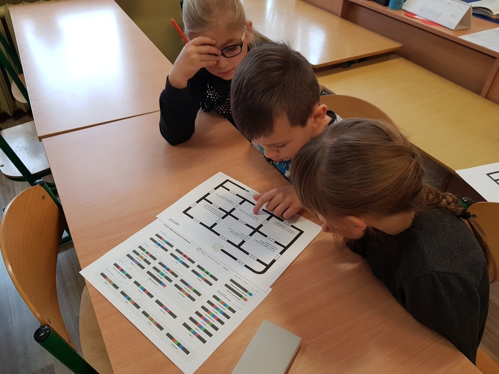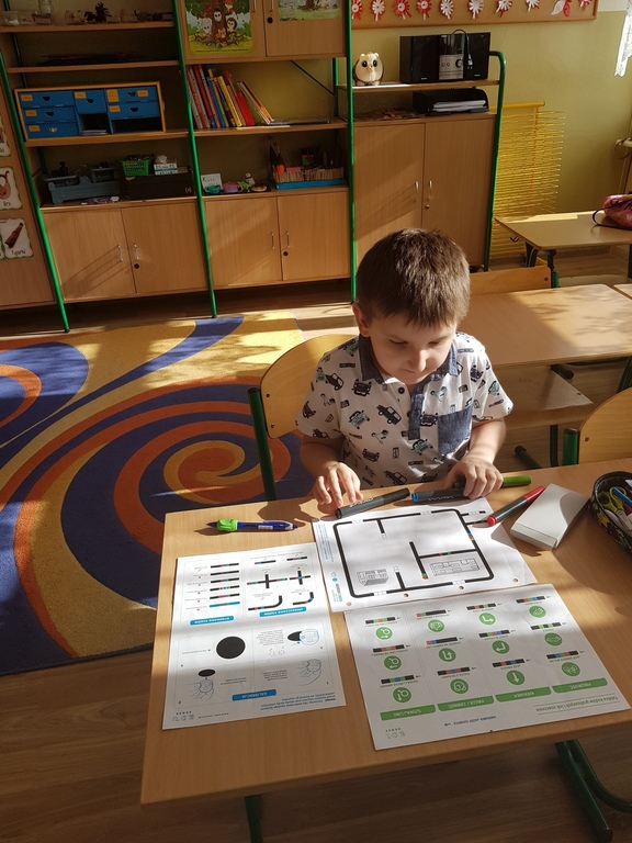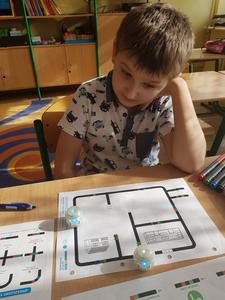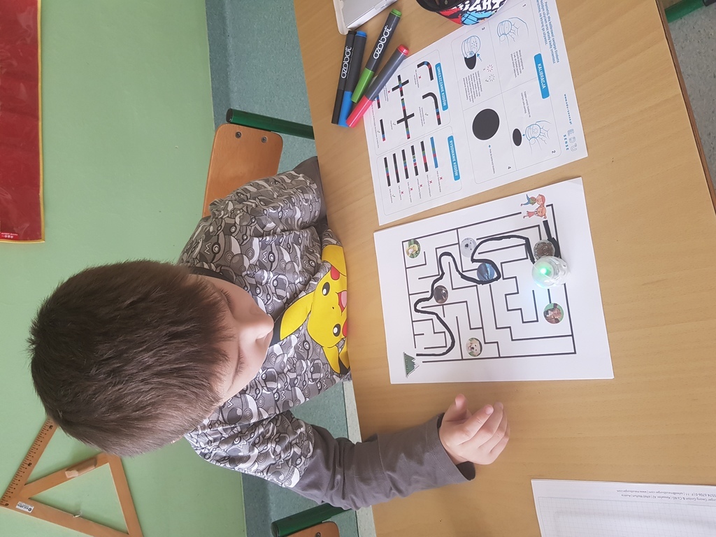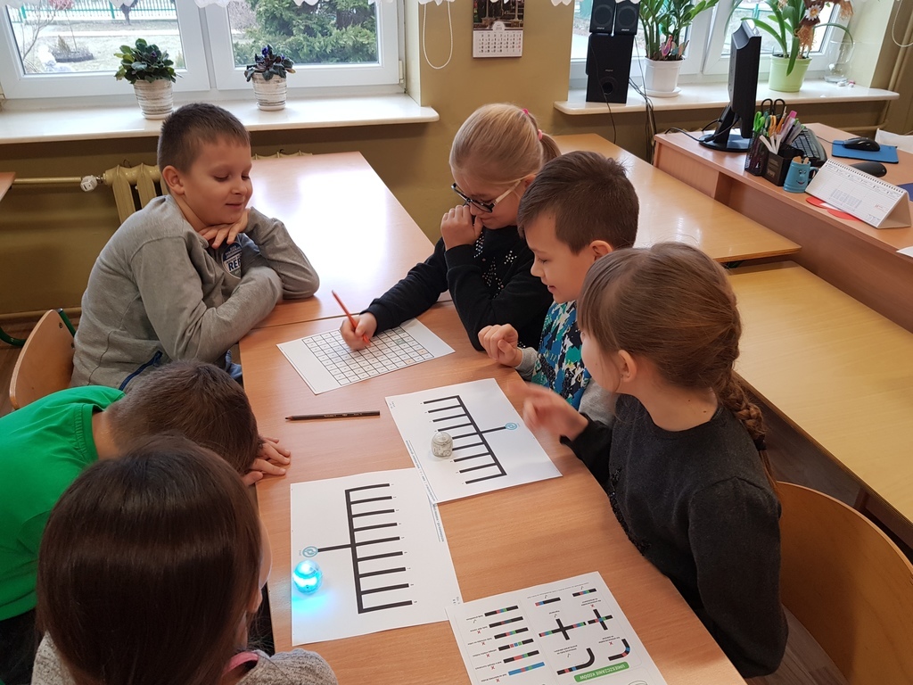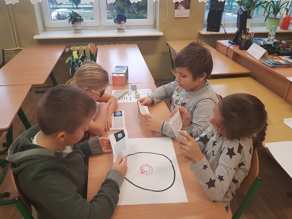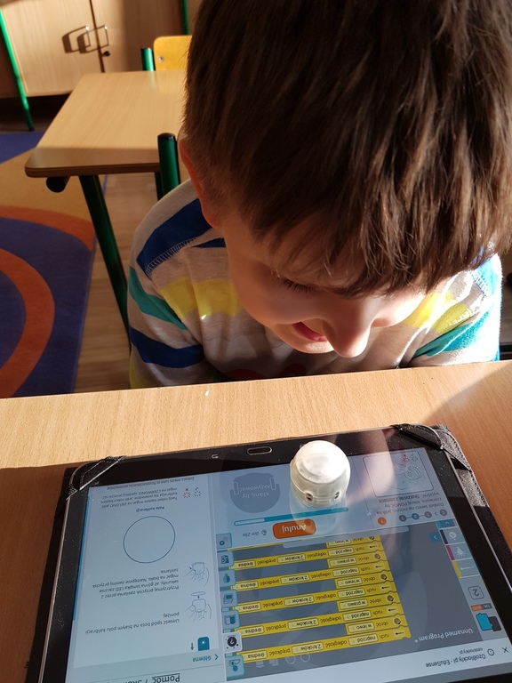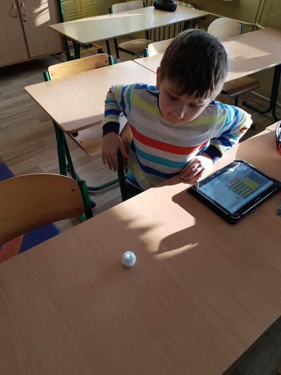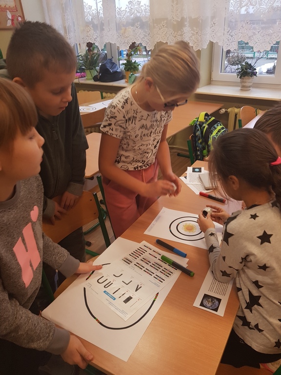 Nowy Rok 2019 przyniósł kolejne wyzwania z ozobotowego programowania. Tym razem klasa 3 musiała zaprogramować ruch robocika Evo z wykorzystaniem dotychczasowej wiedzy, w taki sposób aby zobrazować ruch wybranej planety wokół Słońca. Utrwalaliśmy również kolejność planet w Układzie Słonecznym. Julek miał również możliwość postawić pierwsze kroki na platformie Ozoblockly i tam ułożyć drogę robota według określonego kodu.