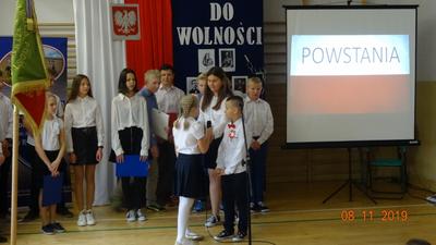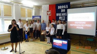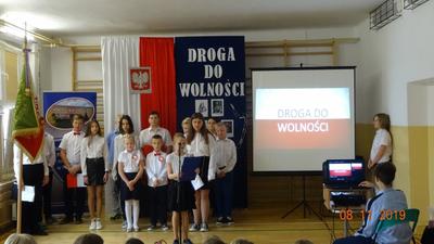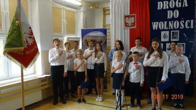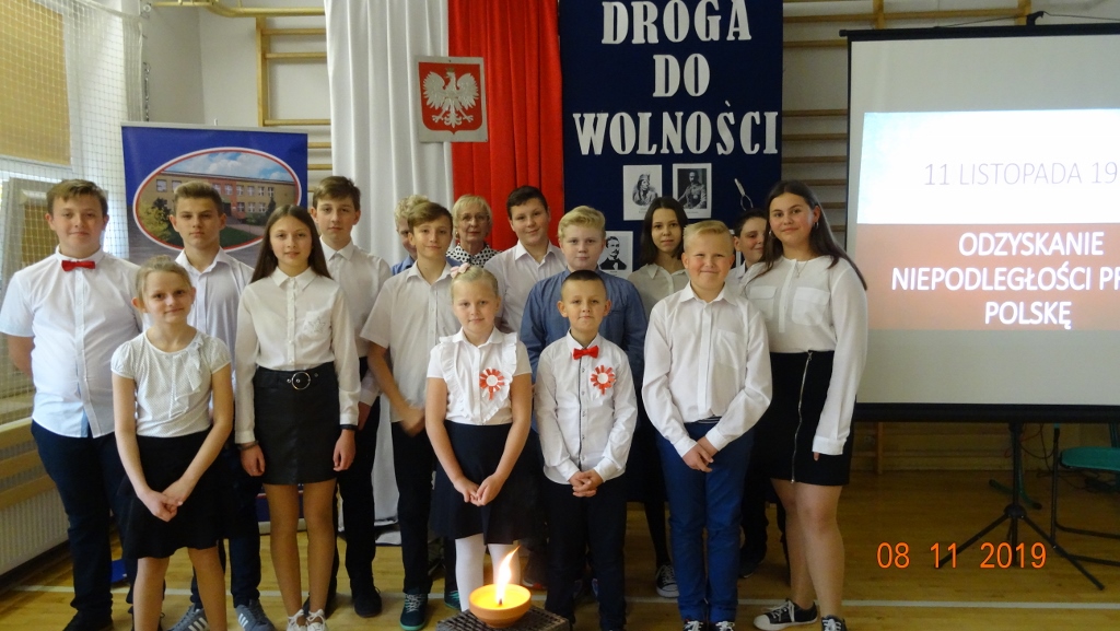 Apel rozpoczęliśmy od zaśpiewania hymnu o godzinie 11:11, dzięki czemu wzięliśmy udział w akcji „ Szkoła do Hymnu’’. Następnie młodzież wyrecytowała wiersze i przedstawiła montaż słowno- muzyczny pt. „Droga do wolności’’. W czasie akademii mogliśmy usłyszeć pieśni i piosenki takie jak: „Rota’’, „Deszcz jesienny deszcz’’, „My pierwsza Brygada’’. Pod koniec uroczystości został zapalony znicz upamiętniający wszystkich poległych. Na końcu wysłuchaliśmy piosenki „Ja to mam szczęście’’.