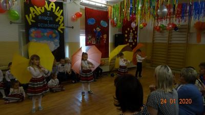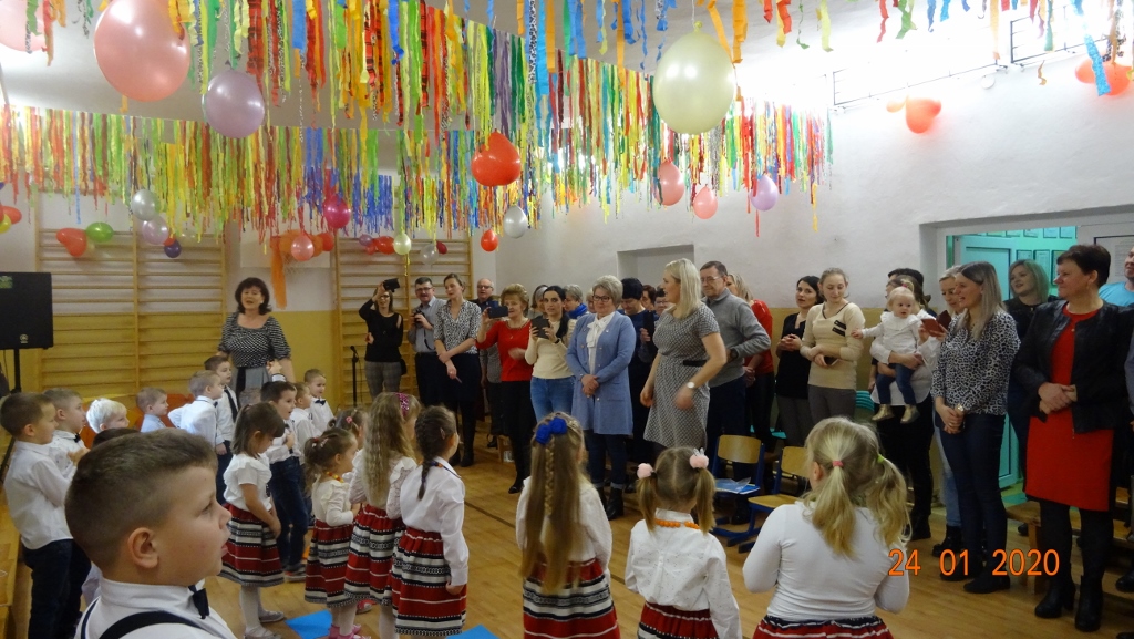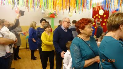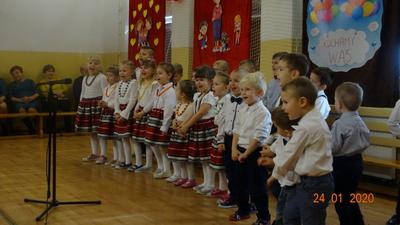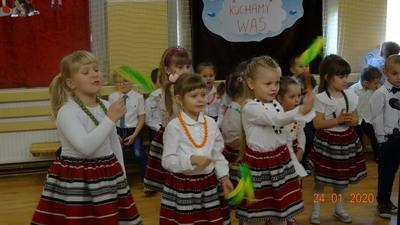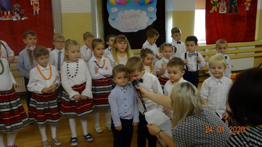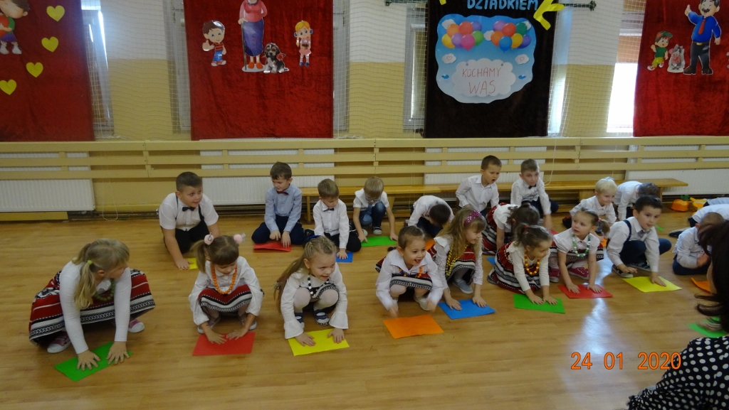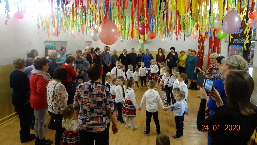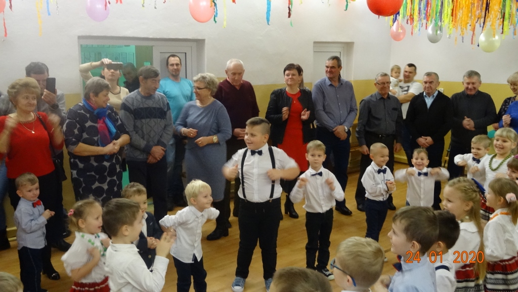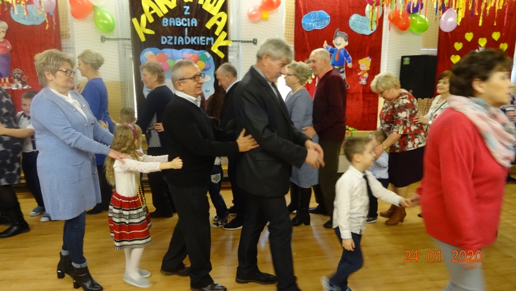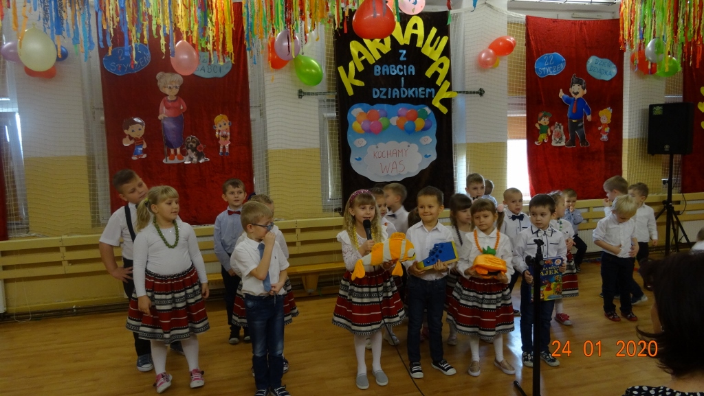 i dziadkowie najmłodszych uczniów dzieci z oddziałów przedszkolnych. Po powitaniu przez panią Dyrektor licznie zgromadzonych gości rozpoczęły się występy dzieci. Były wierszyki, piosenki i inscenizowane tańce. Na zakończenie spotkania dzieci wspólnie z babciami i dziadkami zatańczyli kaczuszki, czaczę oraz wspólny taniec ,,Jedzie pociąg z daleka", który poprowadził jeden z dziadków. Po występie wszystkie babcie i wszyscy dziadkowie zostali zaproszeni do jadalni szkolnej na słodki poczęstunek. Podczas poczęstunku dzieci wręczyły upominki swoim najbliższym. Uroczystość przygotowały Panie: Marzena Warchoł i Anna Kowalczyk.