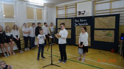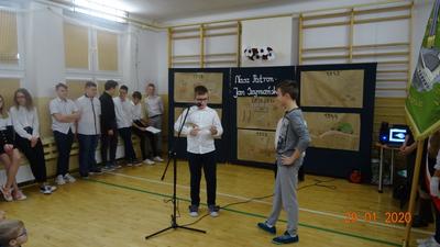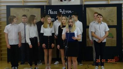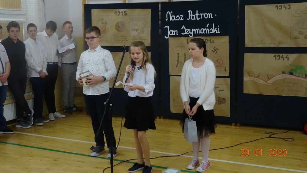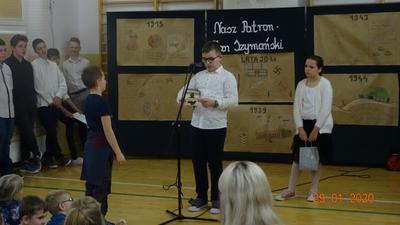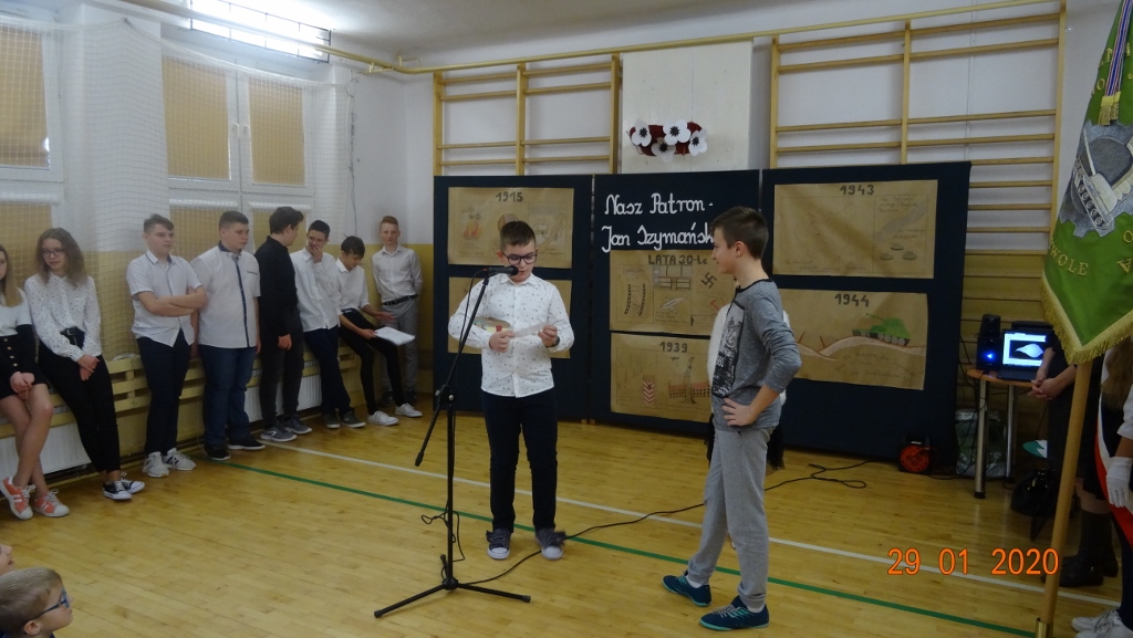 W środę 29 stycznia podczas uroczystego apelu świętowaliśmy Dzień Patrona Szkoły. Klasa 8 pod opieką wychowawczyni Małgorzaty Pietrzyk przypomniała postać chor. Jana Szymańskiego oraz przybliżyła czasy, w których on żył. Informacje przeplatane były piosenkami z epoki oraz zilustrowane plakatami, które jednocześnie stanowiły dekorację przedstawienia. Po występie ósmoklasistów uczniowie klasy 5 pod opieką pani Karoliny Bucior przeprowadzili konkurs wiedzy o Patronie oraz o polskich symbolach narodowych. Nagrodą za dobrą odpowiedź były cukierki.