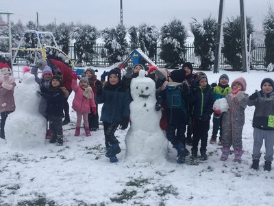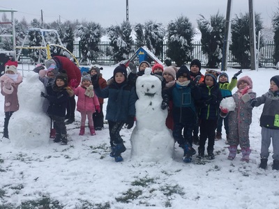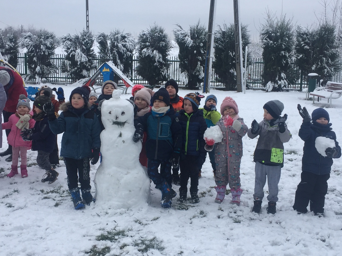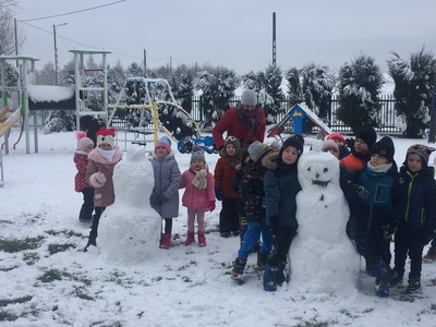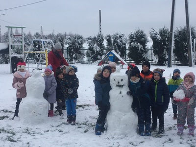 Przedszkolaki w naszej szkole korzystały z uroków zimy, czyli zabaw i gier na śniegu. Lepili bałwana, rzucali się śnieżkami, rzucali do celu, zaśpiewali piosenkę pt.: "Bałwankowa rodzina". Taka forma aktywności znakomicie wpływa na budowanie odporności u dzieci, a zabawy na śniegu pozostaną na długo w naszej pamięci.