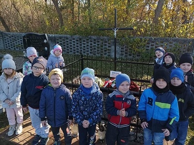 W związku ze zbliżającym się Świętem Zmarłych dzieci z „zerówki” udały się na pobliski cmentarz. Na Grobie Nieznanego Żołnierza zapaliły znicze i wspólnie z panią katechetką odmówiły modlitwę upamiętniając w ten sposób śmierć tych, którzy zapłacili najwyższą cenę za wolność, oddając życie w obronie Ojczyzny. Poprzez odwiedziny na cmentarzu uczymy dzieci szacunku dla zmarłych i właściwego zachowania się w tym szczególnym miejscu.