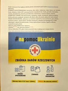 W związku z dramatyczną sytuacją na Ukrainie, Polski Czerwony Krzyż zwraca się z prośbą o pomoc dla mieszkańców kraju ogarniętego wojną. Oprócz zbiórki darów rzeczowych prowadzimy również zbiórkę pieniężną do puszek PCK.