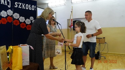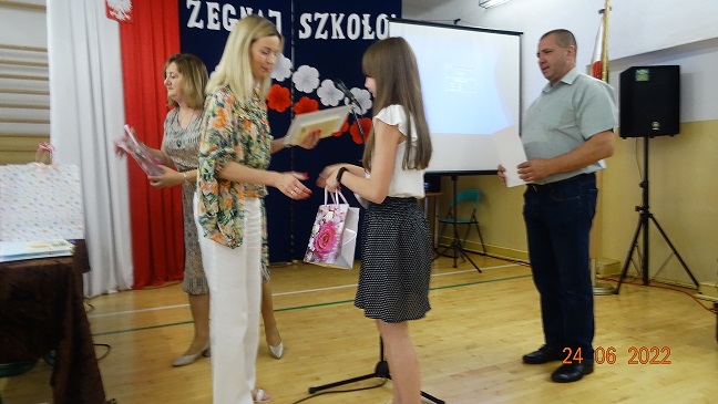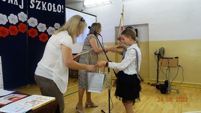 W dalszej części uczniowie klas 4-7, którzy osiągnęli bardzo dobre wyniki w nauce (średnia 4,75) otrzymali z rąk Pani Dyrektor świadectwa z wyróżnieniem oraz nagrody książkowe.