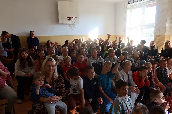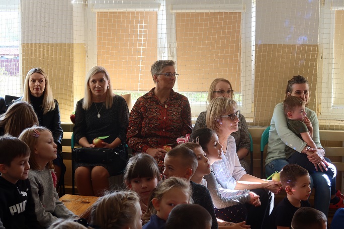 W części artystycznej uczniowie klasy 8 przedstawili żartobliwe scenki z życia szkoły pod hasłem „SZKOŁO, SZKOŁO ALEŻ TU WESOŁO” Następnie pięknym śpiewem podziękowali nauczycielom za ich trudną i ważną pracę. Nauczyciele i pracownicy szkoły otrzymali piękne jabłka z życzeniami.