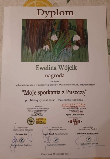 24 listopada 2022r. w Miejskim Ośrodku Kultury w Pionkach wręczono nagrody XXXII edycji konkursu przyrodniczego „Moje spotkania z Puszczą” pt. ,,Niezwykły świat roślin – moje bliskie spotkanie”. Celem konkursu było: zdobywanie i poszerzenie wiedzy przyrodniczej o Puszczy Kozienickiej i Kozienickim Parku Krajobrazowym; podniesienie świadomości ekologicznej uczniów, budowanie postaw proekologicznych oraz uwrażliwienie uczniów na piękno lokalnej przyrody. W tej edycji wzięli udział uczniowie z 25 szkół z powiatu kozienickiego i radomskiego. Prace były oceniane w dziedzinach twórczości fotografia, literatura, plastyka. Uczniowie z naszej szkoły wykonali prace w kategorii plastyka i literatura odnosząc sukces.