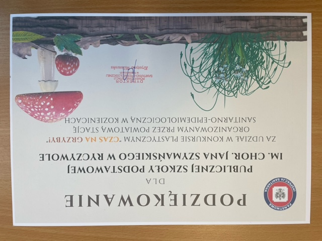 5 grudnia w powiatowej Stacji Sanitarno- Epidemiologicznej w Kozienicach zostały wręczone nagrody w konkursie plastycznym pt. „Czas na grzyby”. Celem konkursu było rozpowszechnienie i pogłębienie wiedzy na temat lasu, grzybów, zatruć grzybami, uświadomienie zagrożeń zdrowia i życia wynikających ze zbierania i spożywania nieznanych grzybów oraz podkreślenie roli grzybów w przyrodzie. Spośród 100 zgłoszonych na konkurs prac wyróżnienie w tym konkursie otrzymała uczennica naszej szkoły Zosia Szpotańska – opiekun p. Agnieszka Miżejewska. Wszyscy uczestnicy konkursu dostali pamiątkowe dyplomy.