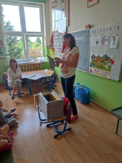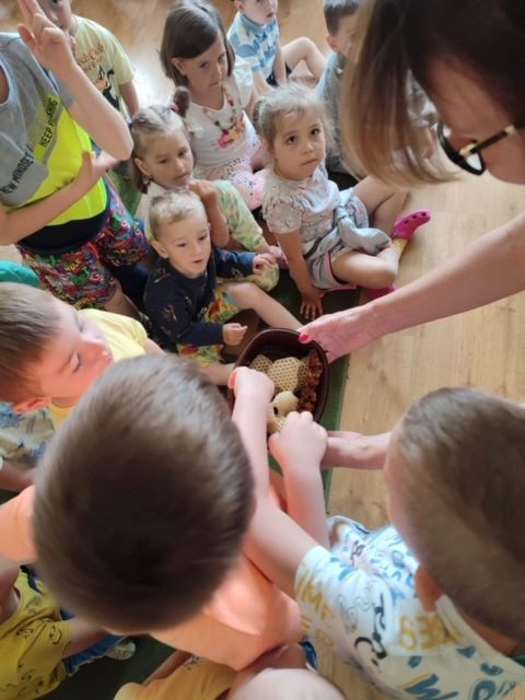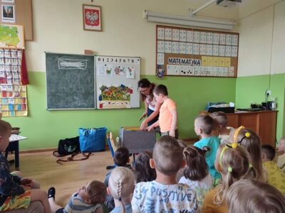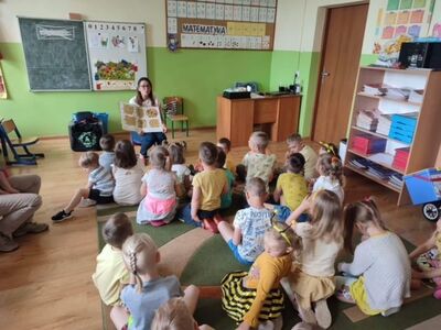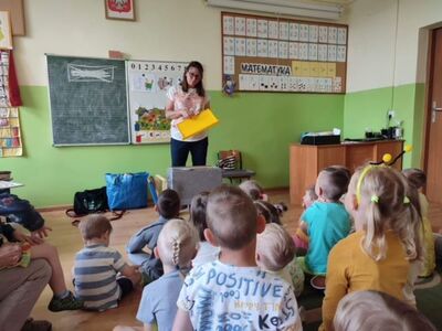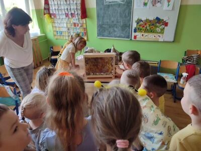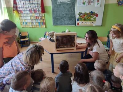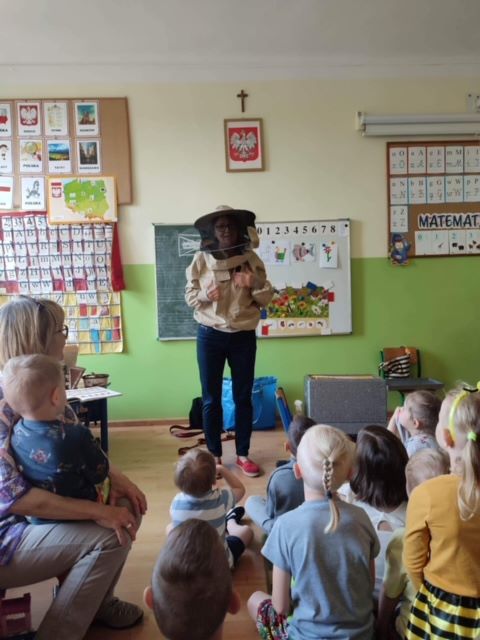 We wtorek, 30 maja 2023 r. dzieci z oddziałów przedszkolnych odwiedziła pani pszczelarz - Edyta Abramczyk. Celem wizyty było poznanie przez dzieci pracy pszczelarza. Pani Edyta przybyła w towarzystwie swoich pszczół, które przywiozła w specjalnym, oszklonym pojemniku. Dzieci z wielkim zainteresowaniem oglądały pracowite owady i poznały produkty ich pracy, a także nazwy pszczół z pszczelej rodziny. Pani Edyta pokazała dzieciom narzędzia i przybory swojej pracy.