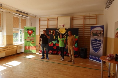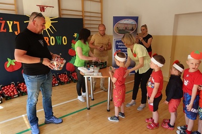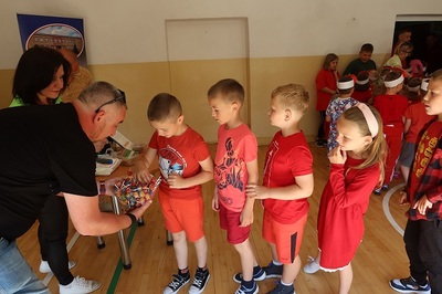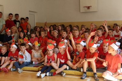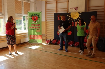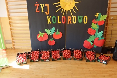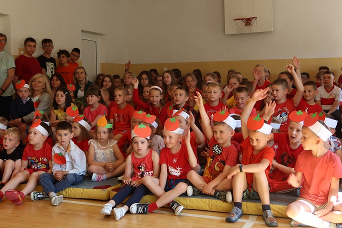 1 czerwca w naszej szkole swoje święto obchodził pomidor. W tym dniu było pomidorowe szaleństwo. Większość uczniów, przedszkolaków i nauczycieli założyło ubrania w kolorze czerwonym. Odwiedzili nas przedstawiciele firmy ,,Pan Pomidor", promując swój lokalny przepyszny produkt. Dzieci z oddziałów przedszkolnych i klas I-III przygotowały akcent artystyczny. Były wiersze, tańce i piosenki. Pan Pomidor obdarował wszystkich smacznymi pomidorkami. Tego dnia był Dzień Dziecka, więc Pan Pomidor pamiętając o wszystkich dzieciach wręczył zebranym lizaki i drobne gadżety z logo firmy. Dzieci dowiedziały się wielu ciekawostek o uprawie tych warzyw, poznały ich nazwy, odmiany i potrawy jakie można z nich przygotować. Było smacznie, kolorowo i zdrowo. Cała społeczność szkolna serdecznie dziękuje firmie Pan Pomidor za wizytę w naszej szkole. Zapraszamy za rok🙂.