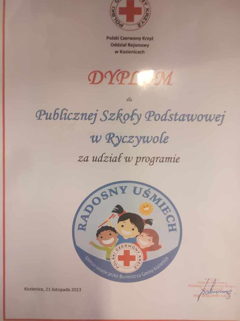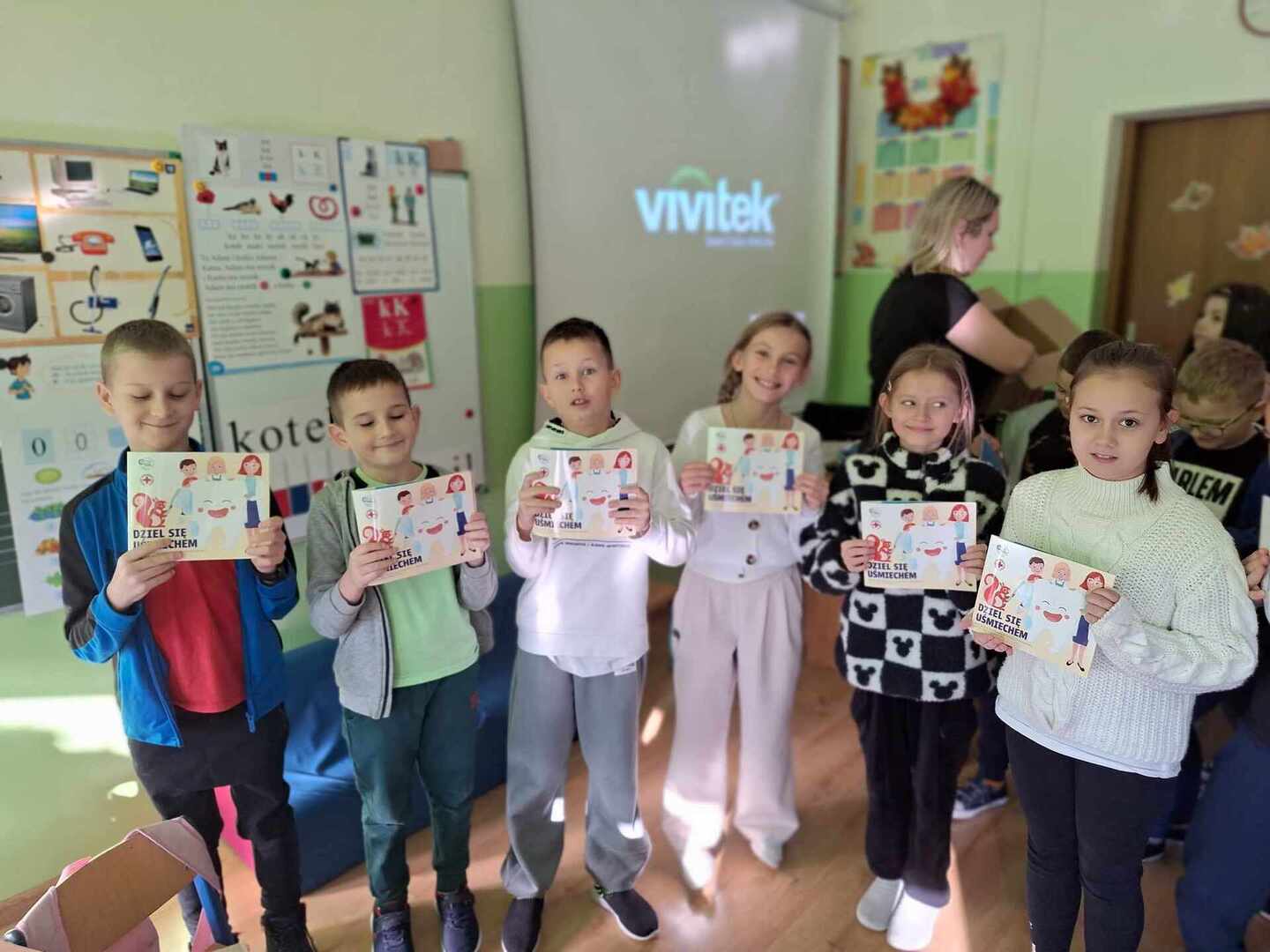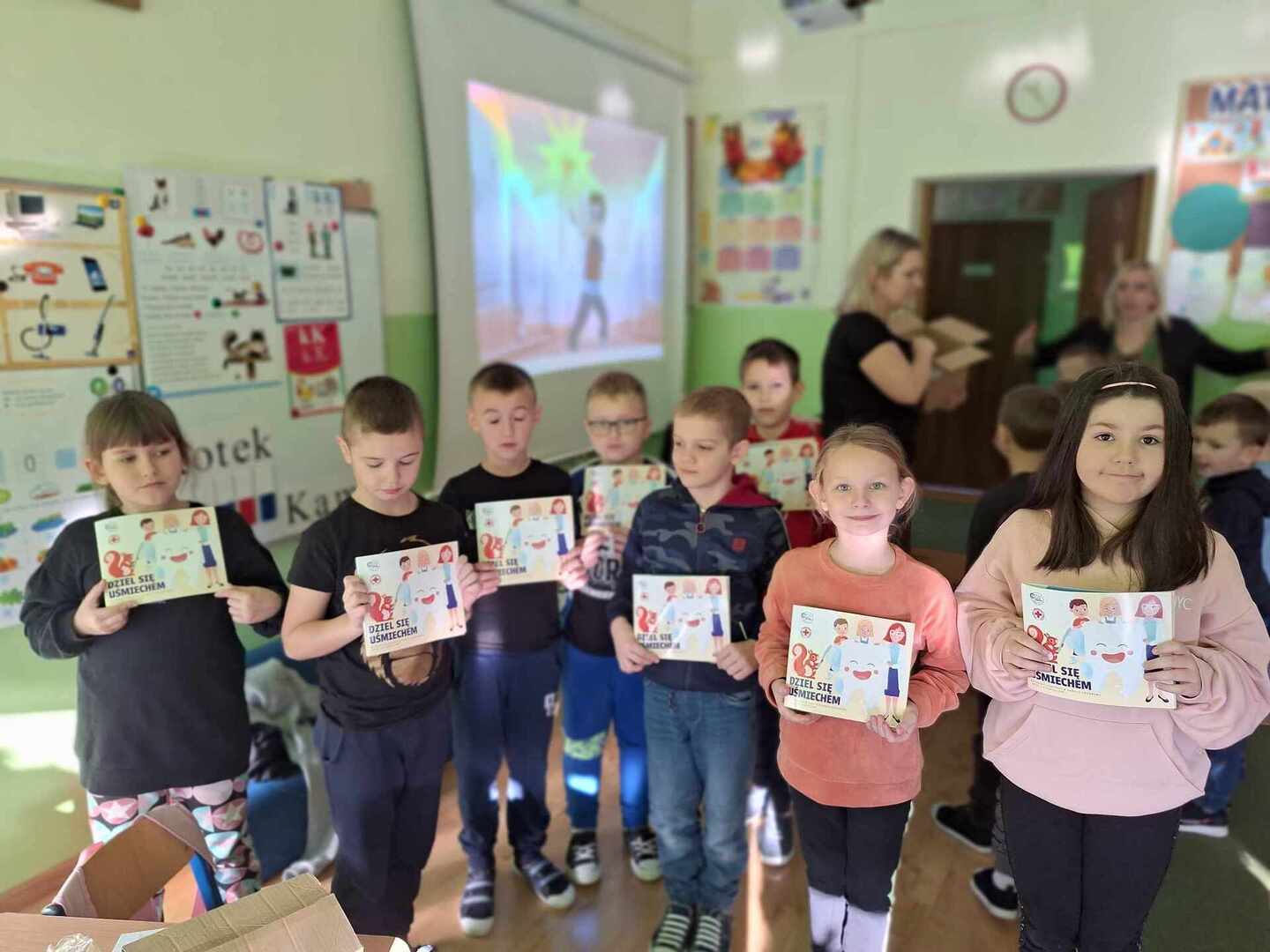 ,,Dziecięcy uśmiech " - to symbol radości, szczęścia, a także symbol zdrowia. W dniu 22 listopada szkolne koło PCK wzięło udział w akcji ,,Radosny uśmiech ".Dzieci z najmłodszych klas obejrzały film. Poznały tym samym zasady prawidłowej higieny jamy ustnej, a także dowiedziały się jak dbać o zdrowe zęby, a tym samym o zdrowy uśmiech. Po filmie, podczas pogadanki, uczniowie podali powody, dla których trzeba dbać o czyste ząbki.