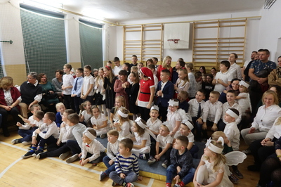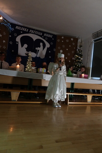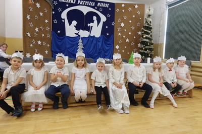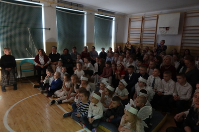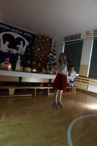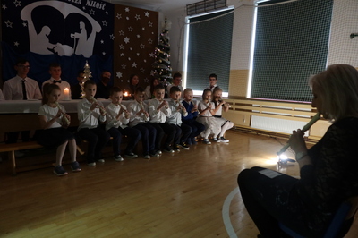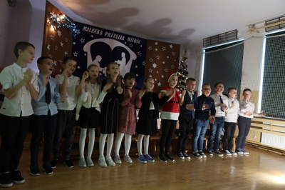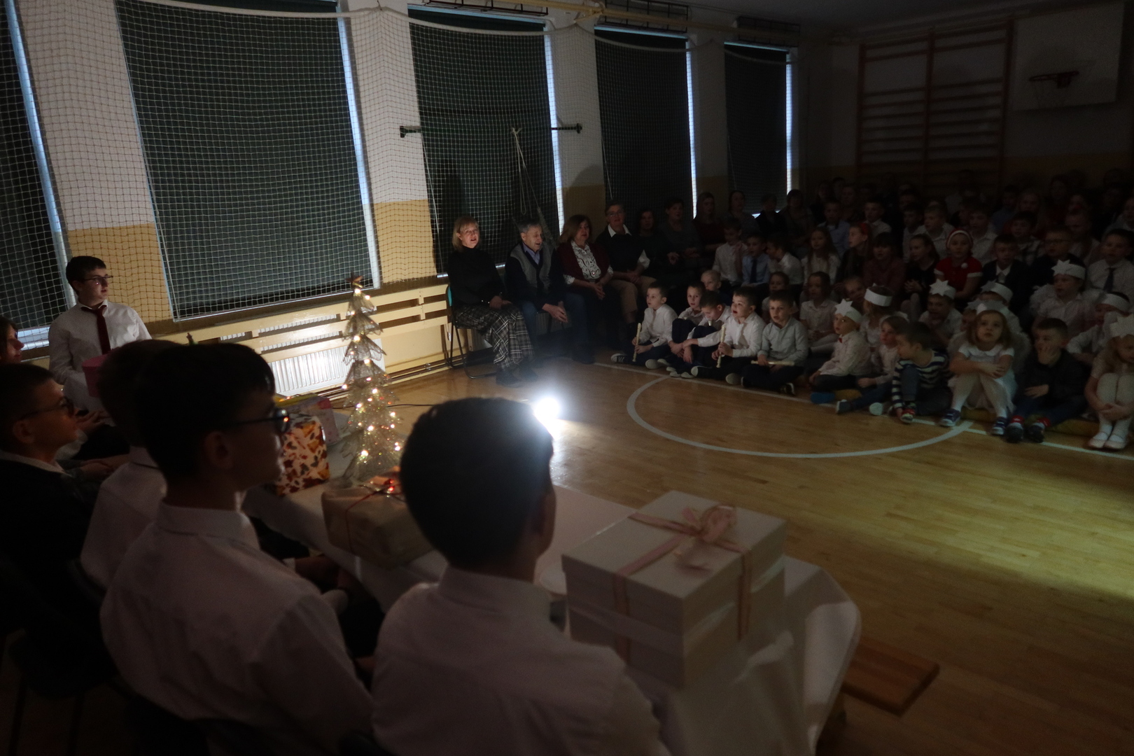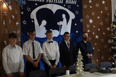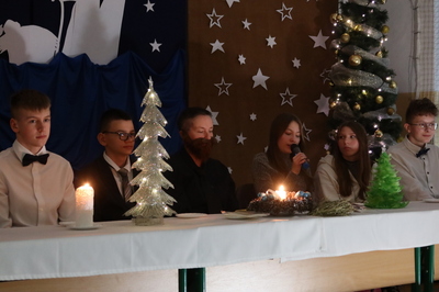 W dniu 22 grudnia 2023 roku uczniowie klas VII i VIII wraz z wychowawcami panią Renatą Strzelczyk i panią Dominiką Tęczą zaprezentowali inscenizację wieczoru wigilijnego, przedstawiając zwyczaje i tradycje związane z tym uroczystym w naszej kulturze dniu. Oprawę muzyczną i wspólne kolędowanie zapewniła nauczycielka muzyki pani Halina Boryczka oraz wychowawcy: oddziału "O"- pani Anna Kowalczyk, klasy I- pani Beata Wrzosek, klasy II- pani Aleksandra Pachocka, klasy III- pani Halina Boryczka z uczniami klas. Życzenia świąteczne uczniom i całej społeczności szkolnej przekazała dyrektor naszej szkoły pani Agnieszka Miżejewska.