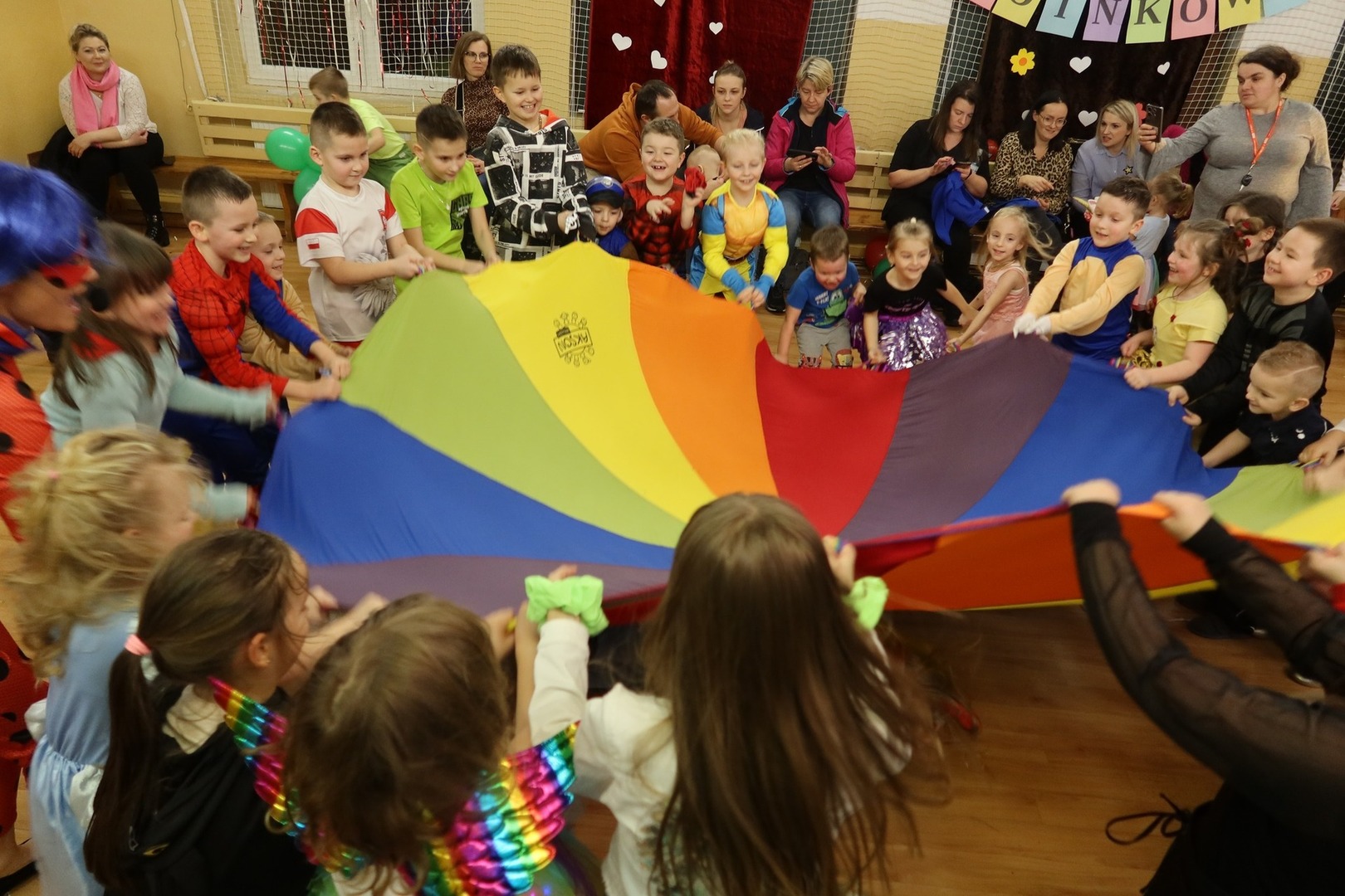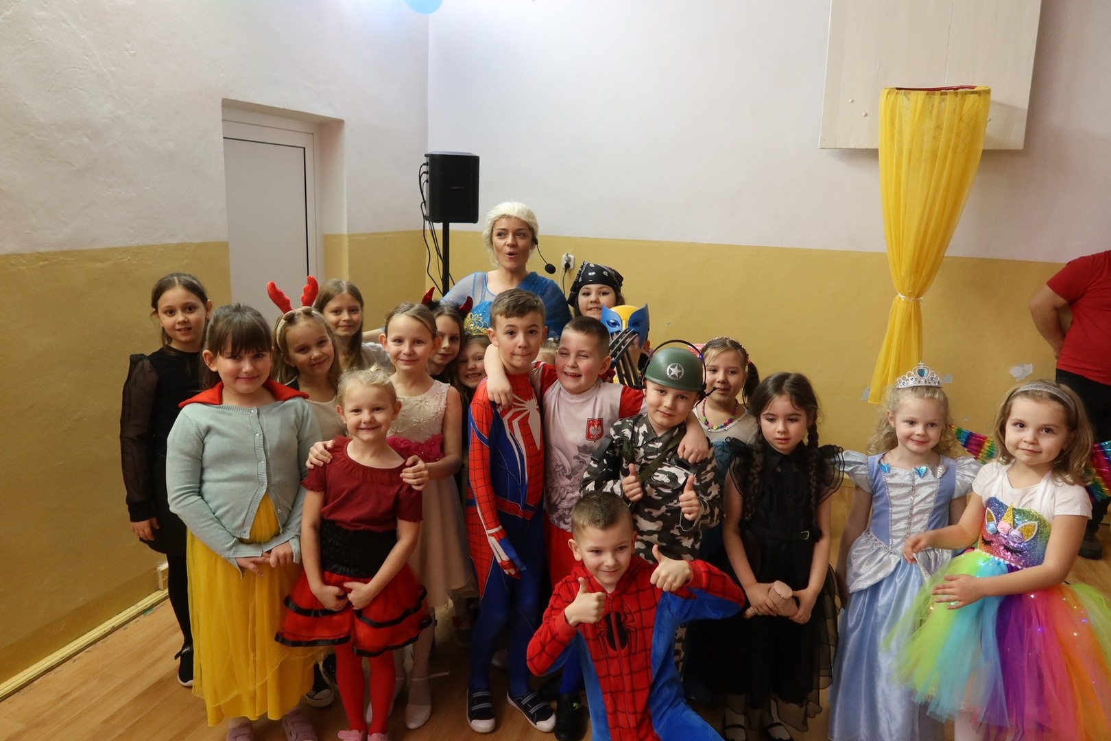 W szkole zaroiło się od Spidermanów, piratów, rycerzy, kowbojów, policjantów... Były wróżki, księżniczki, różne stwory i dziwadła...Nie sposób wymienić wszystkich. Stroje były barwne, oddawały nawet najdrobniejsze szczegóły wybranej postaci. Wszyscy bawili się znakomicie, bo humor dopisywał zarówno dzieciom, wychowawcom jak i rodzicom. Dorośli bawili się wspólnie z dziećmi. Były korowody, kółeczka i tańce w parach. O świetną i profesjonalną oprawę muzyczną i animację zadbała Pani Milena, która serwowała nam doskonałą muzykę i zabawę, za co serdecznie dziękujemy.