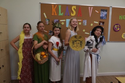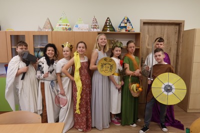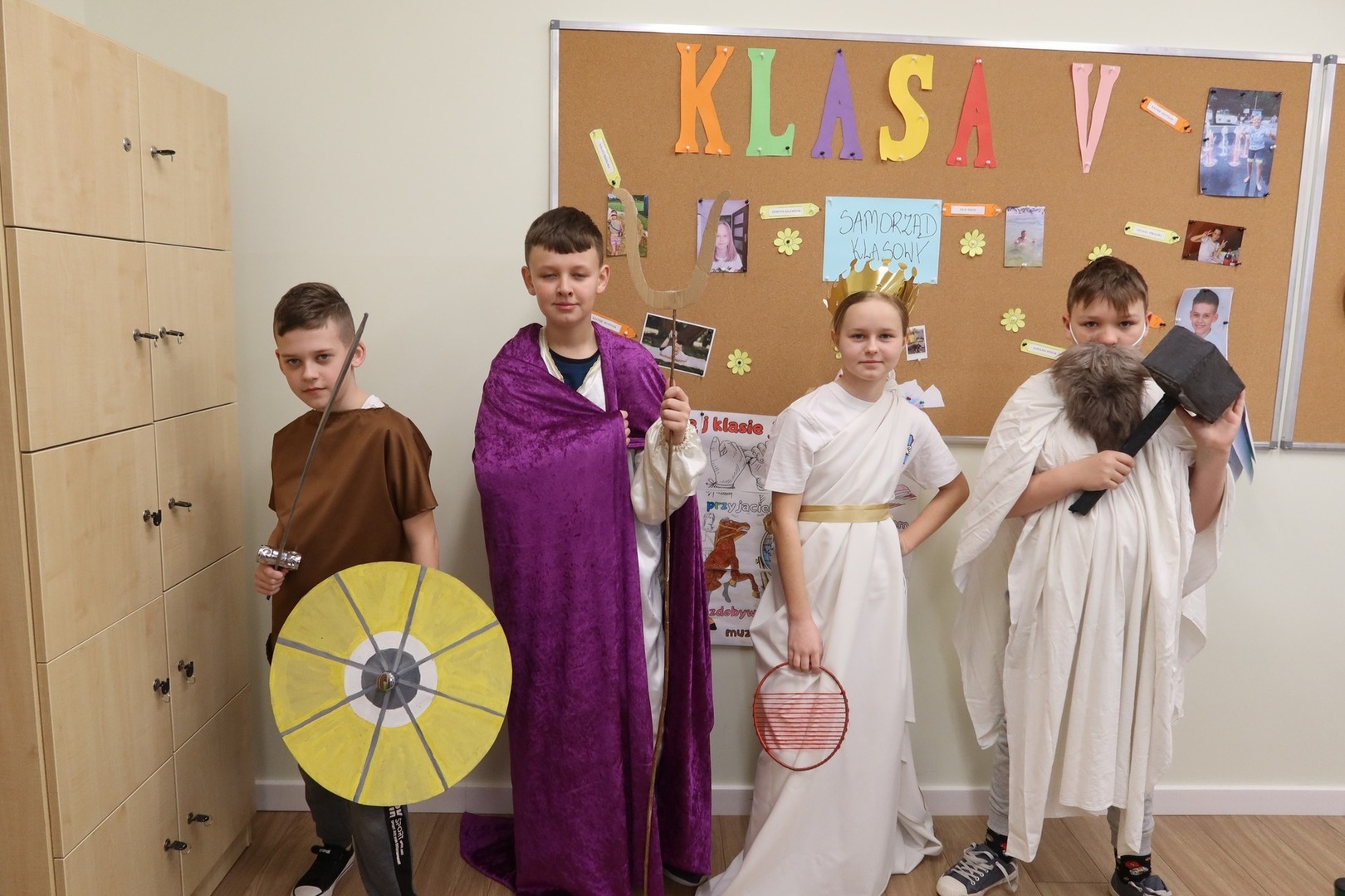 22.03.2024r. w klasie V na lekcji języka polskiego spotkali się uczniowie przebrani za bogów greckich. Był to pomysł na aktywne zajęcia, który miał na celu utrwalenie wiedzy uczniów na temat starożytnej Grecji oraz poznanie ciekawostek na temat poszczególnych bogów. Wszyscy świetnie bawili się podczas przebierania i prezentowania atrybutów władców Olimpu. Nikogo nie dziwił też fakt, że Atena mogła wreszcie założyć trampki…., przecież dziś są ok.