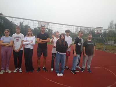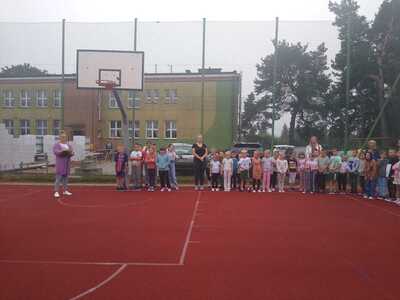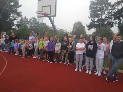 Po sygnale dźwiękowym w postaci - 3 długich dzwonków uczniowie wraz z nauczycielami opuścili budynek szkoły i udali się na miejsce zbiórki czyli boisko szkolne. Nauczyciele na podstawie dziennika przekazali p. Dyrektor Agnieszce Miżejewskiej prowadzącej akcję ewakuacyjną informacje dotyczące stanu liczebności klas.
