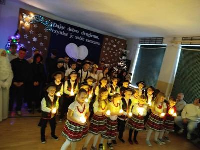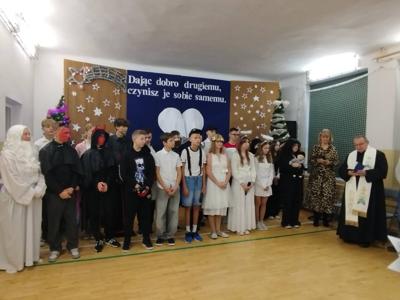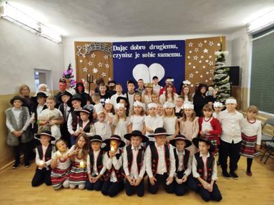 Głównym punktem uroczystości tradycyjnie były jasełka. W tym roku przygotowali je uczniowie klas ósmej i siódmej pod kierunkiem wychowawców – p. Renaty Strzelczyk i p. Małgorzaty Pietrzyk. Kolejne scenki przedstawienia przeplatane były kolędami i pastorałkami w wykonaniu uczniów klas 0, 1, 2 i 3 oraz duetu z klas 4 i 5.