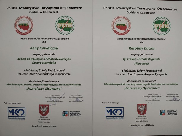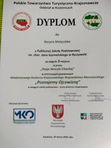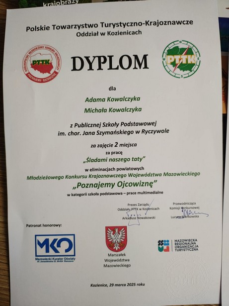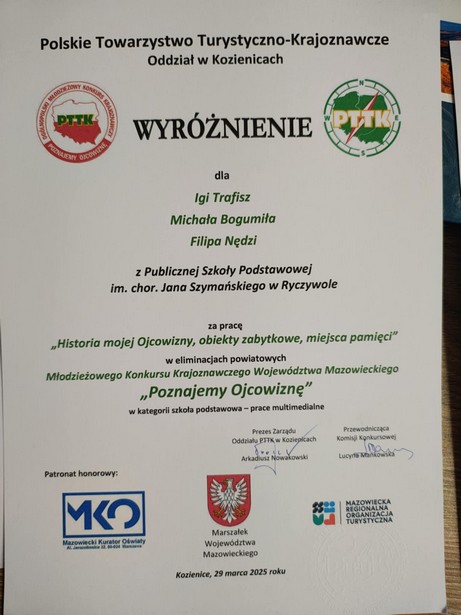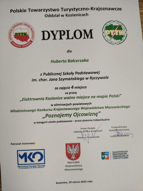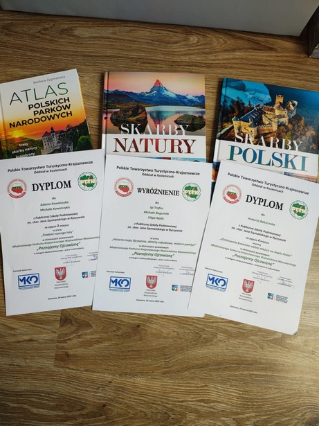 Uczniowie klasy 6 - Iga Trafisz, Michał Bogumił i Filp Nędzi za pracę multimedialną "Historia mojej Ojcowizny, obiekty zabytkowe, miejsca pamięci" otrzymali wyróżnienie. Hubert Balcerzak, uczeń klasy 4 za pracę "Elektrownia Kozienice ważne miejsce na mapie Polski" zajął IV miejsce. II i III miejsce wywalczyli kolejno bracia - Michał (kl. 4)i Adam Kowalczyk(kl. 7) - praca "Śladami mojego taty", Kacper Matysiak (kl. 6) - praca "Pasję Henryki Chachaj". Prace Michała i Adama Kowalczyka oraz Kacpra Matysiaka zostały zakwalifikowane do etapu wojewódzkiego, którego wyniki zostaną ogłoszone 12 kwietnia 2025r.