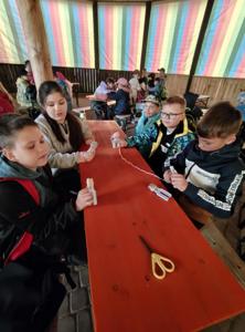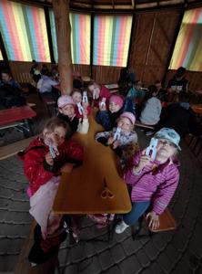 Mimo niesprzyjającej aury dzieci aktywnie uczestniczyły w warsztatach z przewodnikiem. Zrobiły własne pomponiki. Mogły pogłaskać króliczka. Odwiedziły zwierzątka w mini zoo. Z uśmiechem na twarzach wróciły do domu.