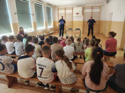 W czasie spotkania funkcjonariusze przypomnieli m.in.: jak bezpiecznie zachowywać się w domu, na placu zabaw, w trakcie wycieczek górskich a przede wszystkim nad wodą. Ostrzegali przed kąpielami w miejscach niedozwolonych a także o konsekwencjach skakania na „główkę”. Tłumaczyli, jak postępować w kontaktach z obcymi oraz jak wzywać pomoc. Rozmawiali również na temat bezpieczeństwa w ruchu drogowym: jak poprawnie przechodzić przez przejście dla pieszych, którą stroną należy iść, gdy nie ma chodnika, dlaczego należy nosić odblaski?