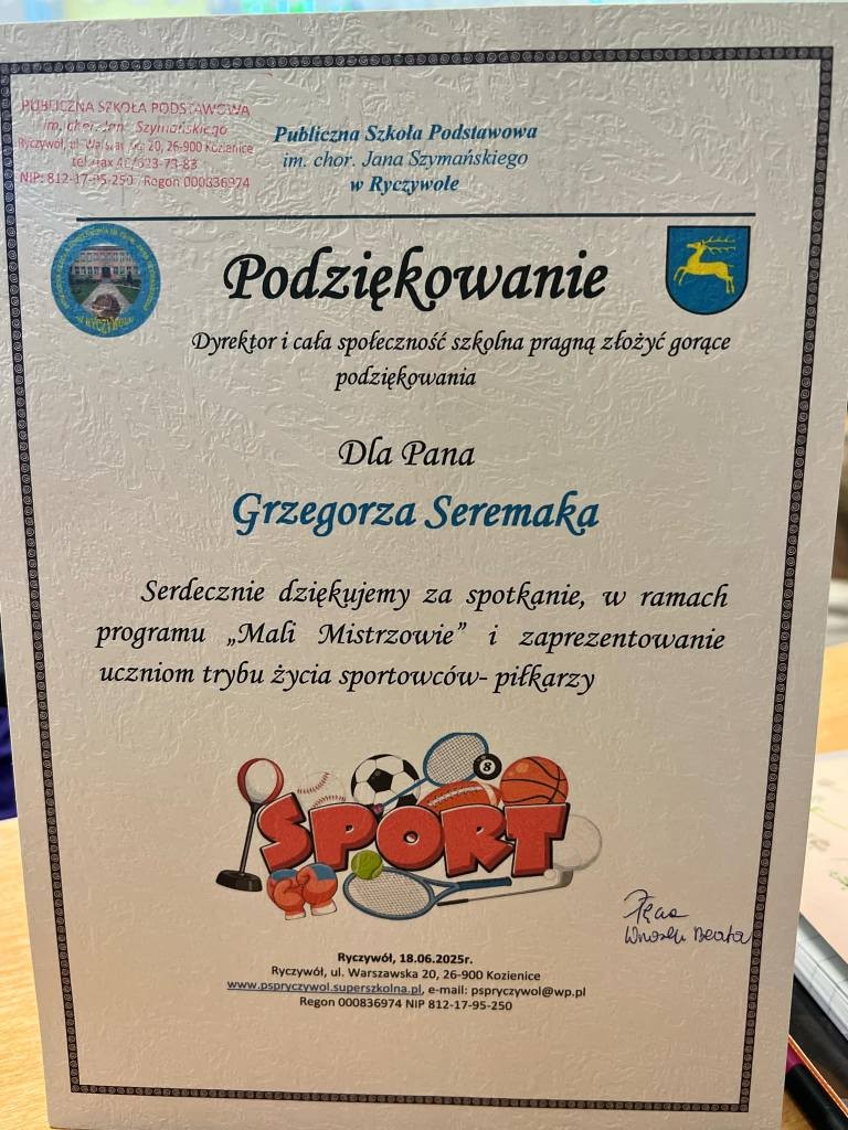W dniu 18 czerwca odbyło się spotkanie ze znanym trenerem i byłym piłkarzem Grzegorzem Seremakiem w ramach programu Mali Mistrzowie. Na spotkaniu dowiedzieliśmy się wiele ciekawostek z życia piłkarzy od samego Króla Strzelców i zdobywcy wielu pucharów.