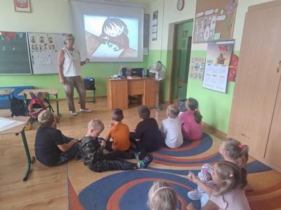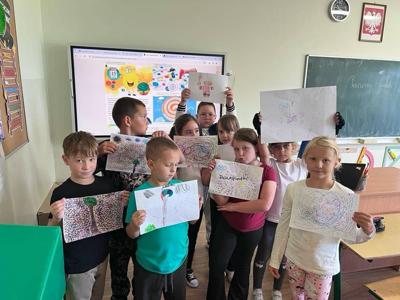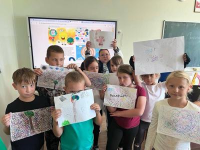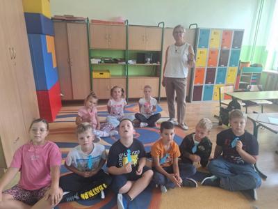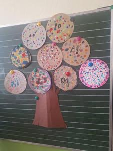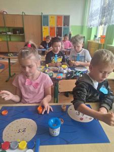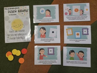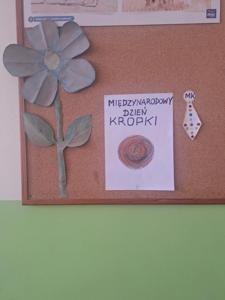 Uczniowie klasy I rozpoczęli dzień 15 września od pokolorowania emblematów, czyli kokardek i krawatów, którymi ozdobili swoje ubrania. Następnie obejrzeli film o kropce to znaczy o dziewczynce imieniem Vashti i obrazu autorstwa Wassilija Kandinskiego. W czasie zajęć plastycznych wykonali farbami pracę inspirowaną kropkami pt.”Drzewo więzi” –Dzień Kropki, którym ozdobili swoją klasę.
