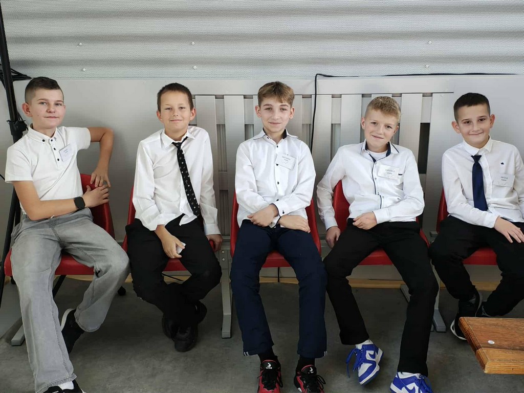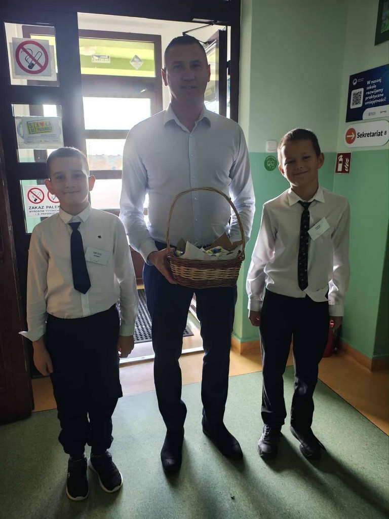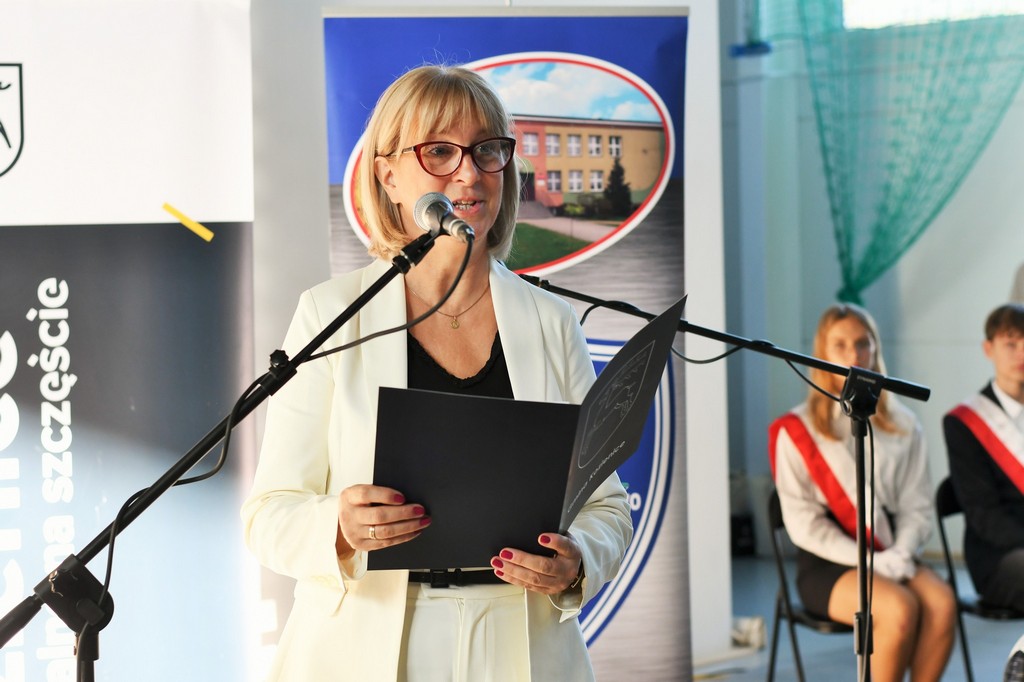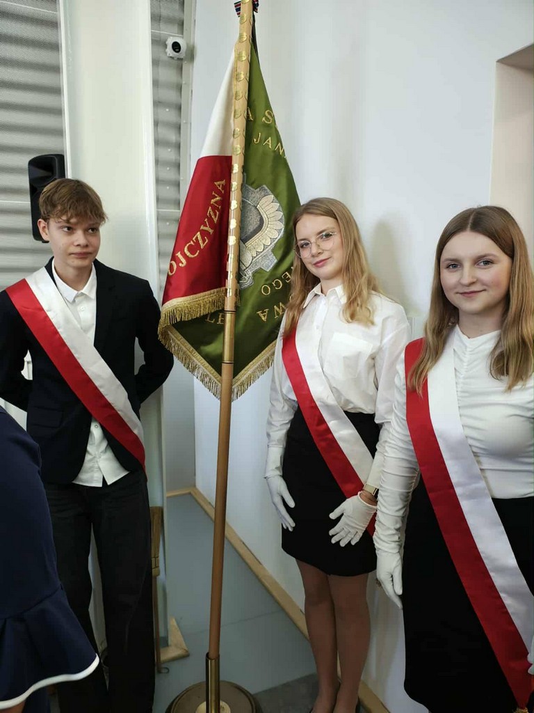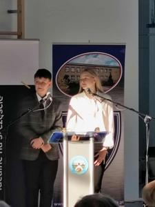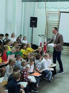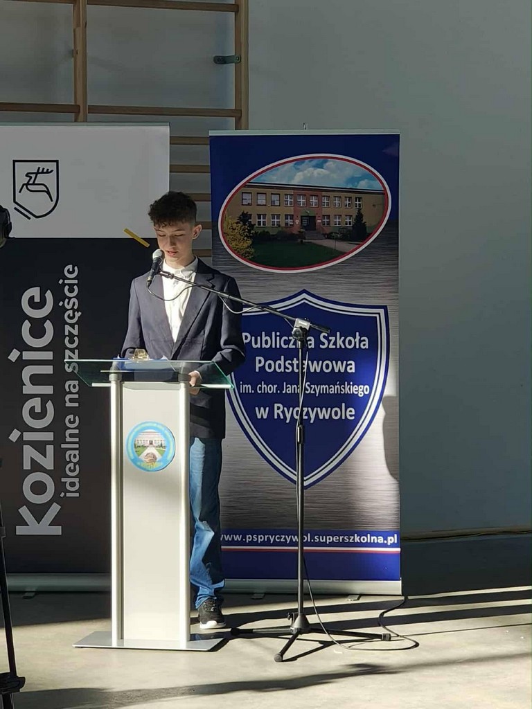 Tym akcentem zakończyliśmy część oficjalną uroczystości i przeszliśmy do części artystyczno-sportowej, którą poprowadzili uczniowie klasy VII – Iga Trafisz i Filip Nędzi.